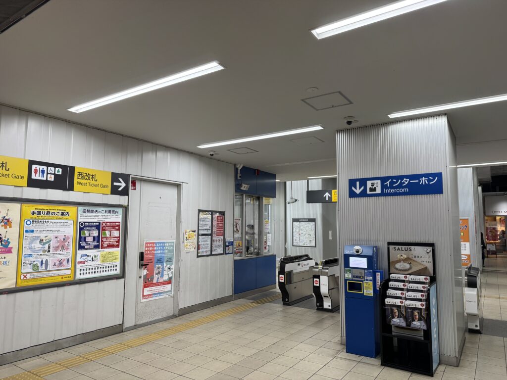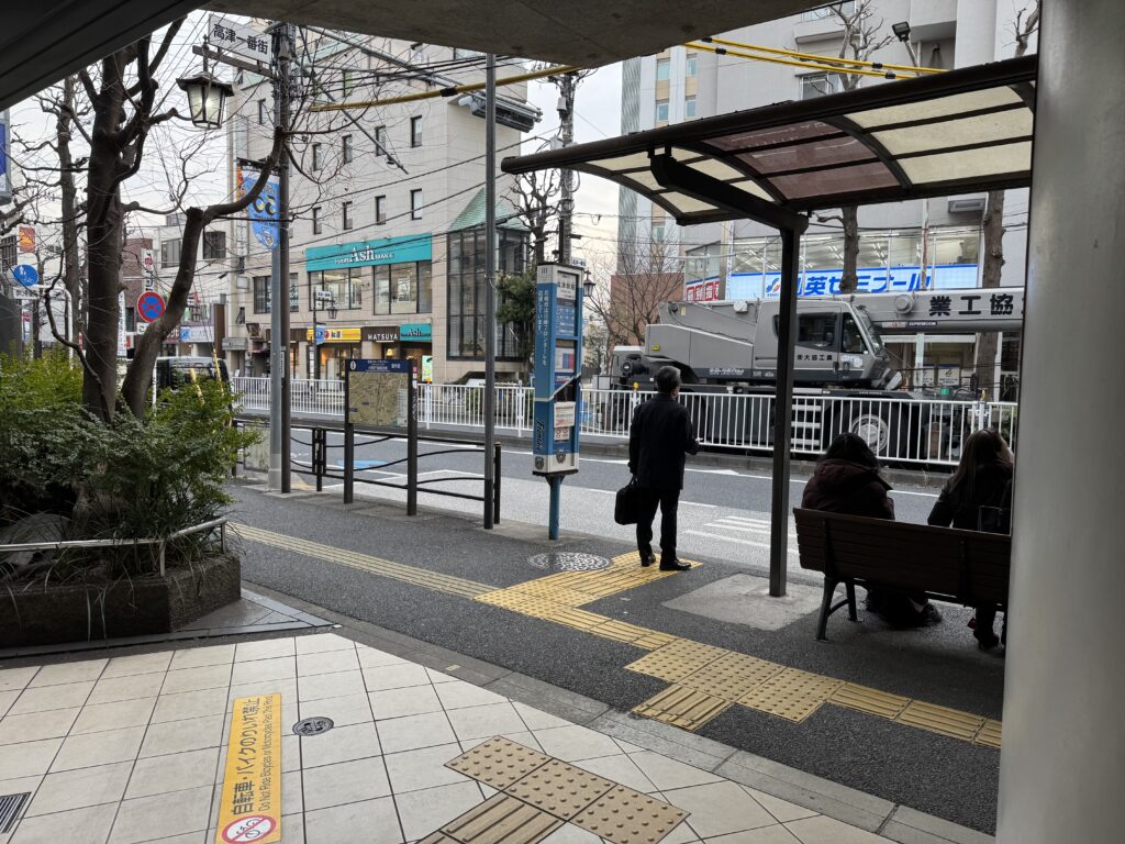 改札を出たら左奥にバス停があるので、その手前を左に曲がり直進していきます。