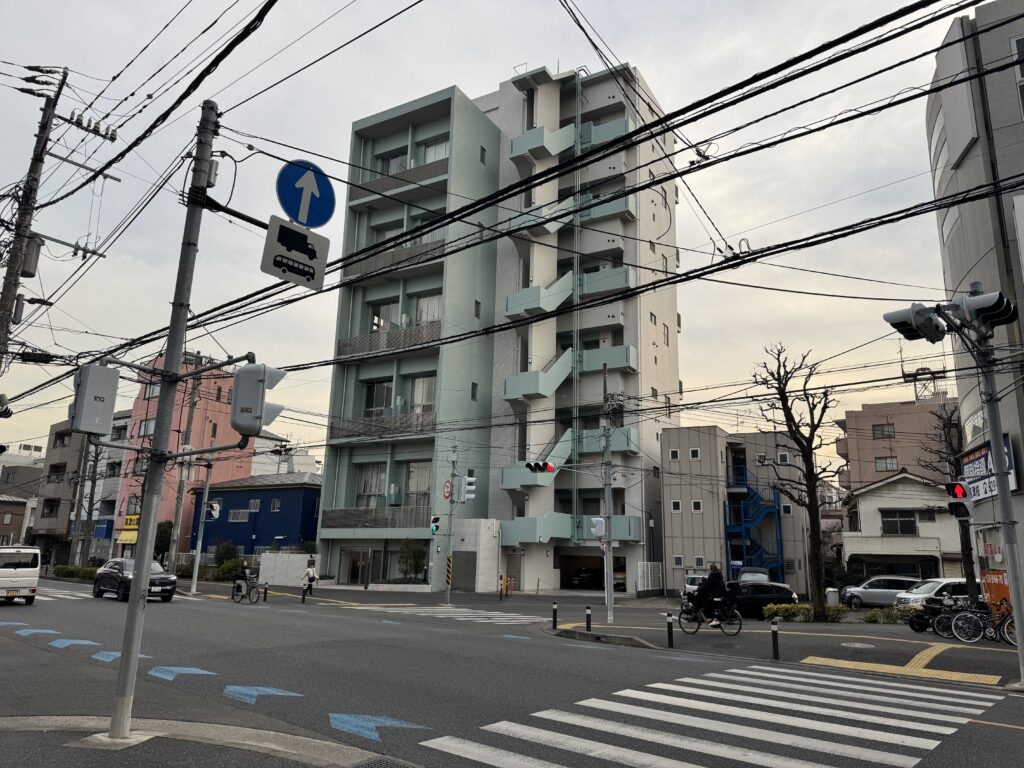 こちらのアパートのある十字路まで進んだら右にある信号を渡ります。